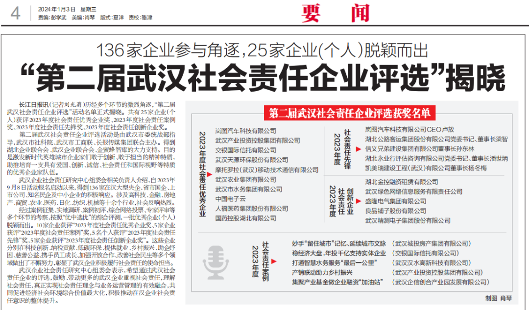 历经多个环节的激烈角逐,2024年1月3日,“武汉第二届社会责任企业评选”活动名单在长江日报正式刊登揭晓,25家企业(个人)脱颖而出。永业行党委书记、董事长潘世炳荣获2023年度社会责任先锋奖。